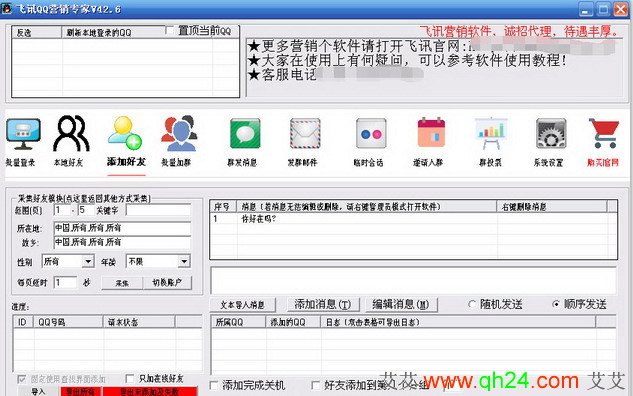 QQ营销飞讯版本是完美的利用qq大用户平台进行各种方式的营销,帮助产品官方销售或者影响出一批人群,从而提高产品的销售业绩,很完美的破解版,欢迎测试使用。。。