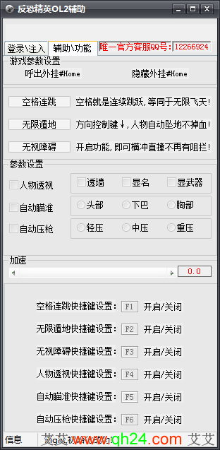 反恐精英ol2透视自瞄飞天遁地辅助工具是该款同名动作射击类网络游戏——《CSOL2》的辅助工具。这款反恐精英ol2透视辅助能帮助玩家在游戏时进行无后座力、透视、加速、隐身、全图高亮等多项操作辅助,让你更轻松获胜!
