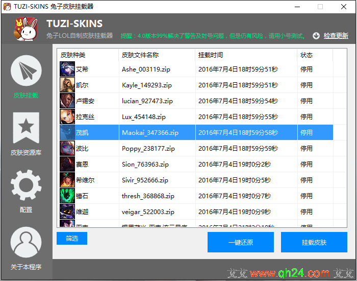 lol兔子皮肤挂载工具是TuziSkins软件,它是一款lol皮肤挂载软件,它内置丰富的皮肤资源库,130+个英雄皮肤资源,玩家可以直接一键选择挂载使用并且安全防封,是各位撸友最好的助手选择,我们争取打造为lol皮肤修改器最好的一款。