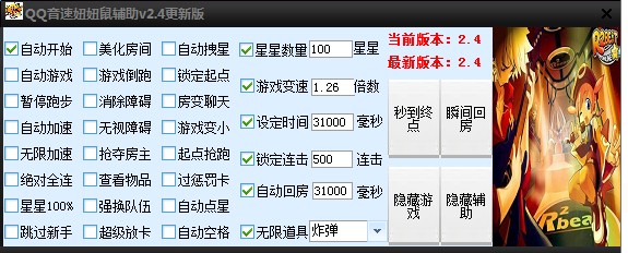 关闭杀毒,登陆游戏后启动外挂按F2开启QQ音速妞妞鼠辅助。