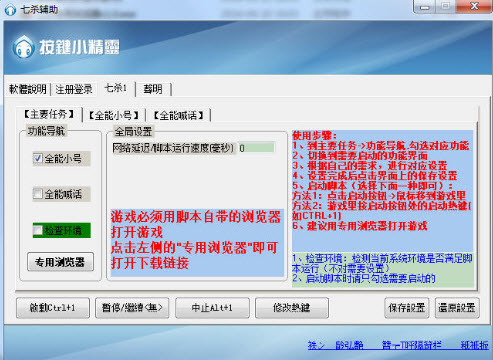 七杀精灵辅助是为著名页游《七杀》制作的一款多功能辅助工具,支持自动小号45级、自动喊话等功能。