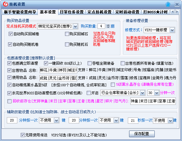 3:增加杀BOSS前先在商店自动买药功能(需在基本设置里勾选并设置),节约绑定元宝