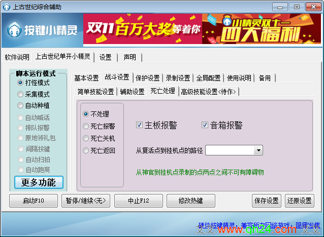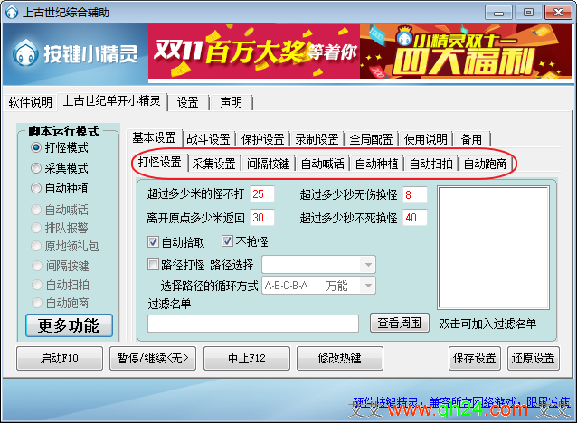 功能特色: 全后台脚本(可最小化),任意分辨率,独创倒计时抢拍助手和长途跨图跑墒, 路径挂机,快速种植+收获,遍历搜怪采集,排队辅助报警,自动领礼包, 路径采集,路径死返,主动寻怪,超强精准拾取(不是无脑按F), 自动返回原点范围(启动脚本的位置),准确快速