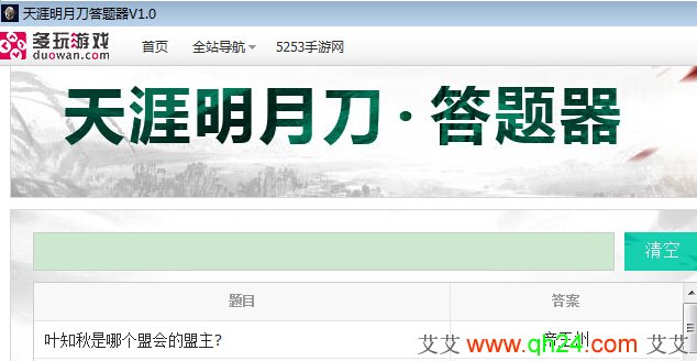 天涯明月刀答题器目前是网上最全的,一共收录了8721道题,输入需要查询题目其中两个以上的词语拼音首字母,例如天刀即“td”即可快速查询,答题器适用于书院研学、雅集奇遇、逍遥答题等活动。