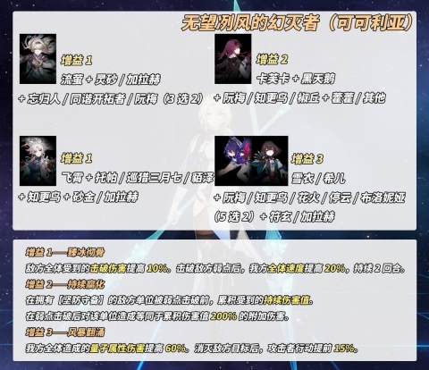 建议②:携带解控或免控队友。可可利亚在两个阶段都拥有较多控制技能,玩家很容易遭到连环控制。从属性方面考虑,可以选择角色“灵砂、符玄、加拉赫”,这些角色能兼顾生存能力与一定程度的属性削韧效果。