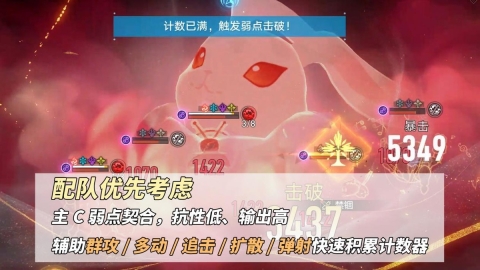 建议①,除了依据弱点属性的契合度来实现快速击破,还可以留意以下类型的角色:群攻、多动、追击、扩散、弹射,利用这些角色能快速积累计数器。所以在进行辅助搭配时,挑选更具攻击性或者具备拉条能力的角色,往往能起到事半功倍的效果~
