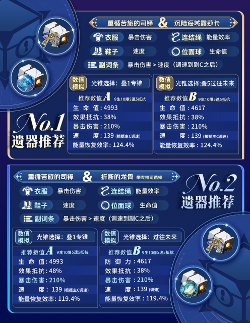 在选择外圈遗器时,最为推荐的是【重循苦旅的司铎】,它不仅能提升速度,还能额外给主C增加爆伤加成。至于内圈遗器,要是不携带专锥,建议选择【沉陆海域露莎卡】,它能在提高回能的同时,提升主C的攻击力(注意要把主C放在配队的首位)。要是携带专锥的话,【沉陆海域露莎卡】、【折断的龙骨】以及【不老者的仙舟】这几款遗器,都可以稳定实现3动1大的效果。